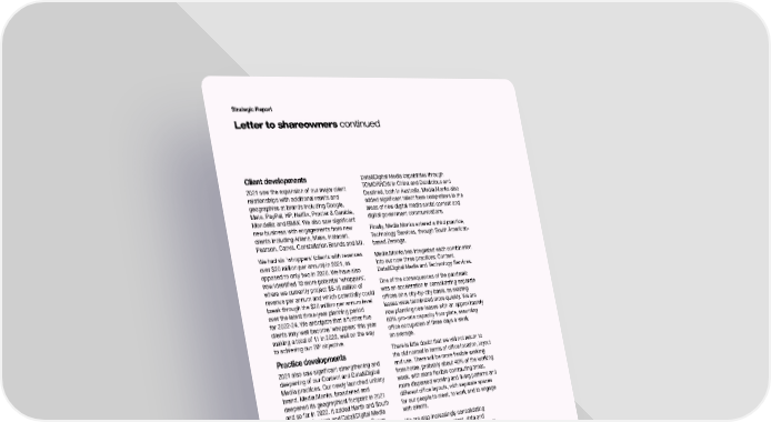 Strategic Report Letter to shareowners continued Client developments Data&Digital Media capabilities through 2021 saw the expansion of our major client TOMORROW in China and Datalicious and relationships with additional remits and Destined, both in Australia. Media.Monks also geographies at brands including Google, added significant talent from competitors in the Meta, PayPal, HP, Netflix, Procter & Gamble, areas of new digital media social content and Mondeleˉz and BMW. We also saw significant digital government communications. new business with engagements from new Finally, Media.Monks entered a third practice, clients including Allianz, Miele, Instacart, Technology Services, through South American- Pearson, Canva, Constellation Brands and M1. based Zemoga. We had six ‘whoppers’ (clients with revenues Media.Monks has integrated each combination over $20 million per annum) in 2021, as into our now three practices: Content, opposed to only two in 2020. We have also Data&Digital Media and Technology Services. now identified 19 more potential ‘whoppers’, One of the consequences of the pandemic where we currently project $5-15 million of was an acceleration in consolidating separate revenue per annum and which potentially could offices on a city-by-city basis, as existing break through the $20 million per annum level leases were terminated more quickly. We are over the latest three-year planning period now planning new leases with an approximately for 2022-24. We anticipate that a further five 60% pro-rata capacity floor plate, assuming clients may well become ‘whoppers’ this year office occupation of three days a week making a total of 11 in 2022, well on the way on average. to achieving our 202 objective. Practice developments There is little doubt that we will not return to the old normal in terms of office location, layout 2021 also saw significant strengthening and and use. There will be more flexible working deepening of our Content and Data&Digital from home, probably about 40% of the working Media practices. Our newly launched unitary week, with more flexible commuting times, brand, Media.Monks, broadened and more dispersed working and living patterns and deepened its geographical footprint in 2021 different office layouts, with separate spaces and so far in 2022. It added North and South for our people to meet, to work and to engage American Content and Data&Digital Media with clients. capabilities through Jam3, Racoon Group, We are also increasingly consolidating Cashmere, Maverick Digital and 4 Mile. our strategic, client content, data and In Europe, Middle East & Africa, Media.Monks programmatic and technology services offer entered the German and Italian markets at the S4Capital level. through STAUD STUDIOS and Miyagi. In Asia Pacific, we added Content and Media.Monks entered a third practice, Technology Services, through South American-based Zemoga 12 S4Capital Annual Report and Accounts 2021