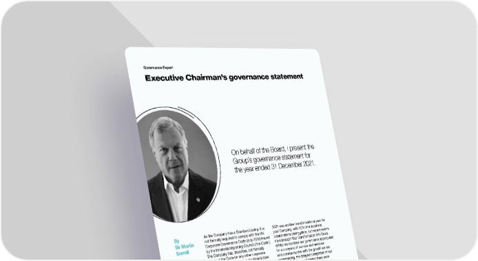 Governance Report Executive Chairman’s governance statement On behalf of the Board, I present the Group’s governance statement for the year ended 31 December 2021. By As the Company has a Standard Listing, it is 2021 was another transformational year for Sir Martin not formally required to comply with the UK your Company, with 10 further business Sorrell Corporate Governance Code (July 2018) issued combinations taking place, but recent events by the Financial Reporting Council (‘the Code’). have brought that transformation into focus. The Company has, therefore, not formally Whilst we consider our governance appropriate adopted the Code (or any other corporate for a company of our size and ambition governance code), although the Board does and commensurate with the growth we are keep in mind the provisions and principles of experiencing, the delayed completion of our the Code when making governance decisions. audit for 2021 has highlighted there were As the Group was formed from Dutch and US deficiencies in our internal controls and our headquartered businesses, and has made ability to produce timely information. We must many international business combinations, do and will do better. it was not initially considered appropriate to We had already recognised that more adopt the Code. However, the Directors have investment was required in our finance team. kept the matter under review and it is currently One of Mary Basterfield’s objectives when she proposed that the Company adopt the Code was appointed in January 2022 was to consider in FY2023, and preparations to do so are the structure of the finance team globally and under way. to add to it where required. We had several The Board has a Nomination and Remuneration senior personnel changes in the finance team Committee and an Audit and Risk Committee, of our Content division during 2021 which both comprised of independent Directors. undoubtedly didn’t help the evolution of our The terms of reference of these committees internal controls. We have since appointed a are available on the Company’s website, new CFO for our Content practice and a new www.s4capital.com. Group Financial Controller alongside a number We believe that governance, especially in of other senior hires within the Content practice relation to environmental and social issues, and at Group level. is critical to good business and we are The Board intends to build out the Company’s committed to upholding the ethical standards internal control team and is in the process of to which our people and clients aspire. securing internal audit provision from a large accounting firm. 56 S4Capital Annual Report and Accounts 2021