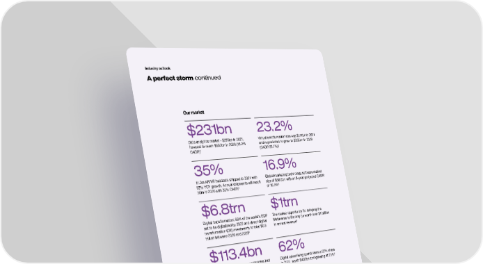 Industry outlook A perfect storm continued Our market $231bn 23.2% Data analytics market - $231bn in 2021, Virtual events market size was $114bn in 2021 forecast to reach $550bn in 2028 (13.2% and is predicted to grow to $505bn in 2028 1 2 CAGR) (CAGR 23.7%) 35% 16.9% 11.2m AR/VR headsets shipped in 2021 with Global marketing technology software market 92% YOY growth. Annual shipments will reach size of $56.5bn with an 8-year projected CAGR 50m in 2026 with 35% CAGR3 of 16.9%4 $6.8trn $1trn Digital transformation: 65% of the world’s GDP The market opportunity for bringing the set to be digitalized by 2022 and direct digital Metaverse to life may be worth over $1 trillion transformation (DX) investments to total $6.8 in annual revenue6 trillion between 2020 and 20235 $113.4bn 62% World’s 25 biggest agency companies had Digital advertising spend takes a 62% share 7 8 combined revenues of $113.4bn in 2020 in 2021, worth $432bn and growing at 29% 27.6% Global ecommerce sales rose 16.8% to 9 $4.92trn in 2021 Sources: 1. Big Data Analytics Report, Fortune Business Insights, 5. IDC FutureScape: Worldwide IT Industry 2021 Predictions Dec 2021 6. The Metaverse, Grayscale Research, Nov 2021 2. GrandView Research, Virtual Events Market Size 2021, 7. AdAge, Mar 2021 8 Jul 2021 8. MoffettNathanson Advertising Spend Model, Mar 2022 3. IDC AR/VR Headset Tracker, Mar 2022 9. eMarketer Global eCommerce Update, Jan 21 4. GrandView Research, Digital Marketing Software Market Size 2021, 8 Jul 2021 42 S4Capital Annual Report and Accounts 2021