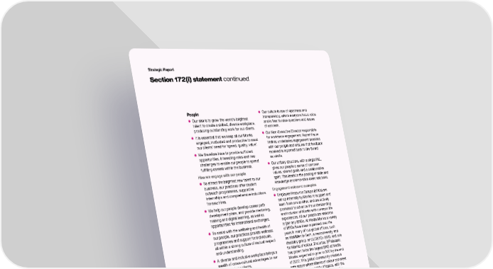 Strategic Report Section 172(i) statement continued People • Our culture is one of openness and • Our aim is to grow the world’s brightest transparency, where everyone has a voice talent to create a skilled, diverse workplace, and is free to raise questions and issues producing outstanding work for our clients. of concern. • It is essential that we keep all our Monks • Our Non-Executive Director responsible engaged, motivated and productive to meet for workforce engagement, Rupert Faure our clients’ need for ‘speed, quality, value’. Walker, undertakes engagement sessions • We therefore have to provide sufficient with our people and ensures that feedback opportunities, interesting roles and new received is reported back to the Board challenges to enable our people to spend as whole. fulfilling careers within the business. • Our unitary structure, with a single P&L, How we engage with our people gives our people a sense of common values, shared goals and a collaborative • To attract the brightest new talent to our spirit. This leads to the pooling of skills and business, our practices offer student knowledge and innovative client solutions. outreach programmes, supportive Engagement outcome: examples internships and comprehensive inductions • Employee Resource Groups (ERGs) are for new hires. set up internally by Monks to support and • We help our people develop career path learn from one another, and are actively development plans, and provide mentoring, promoted to advance the understanding training and digital learning, as well as and inclusion of Monks with common life opportunities for international exchanges. experiences. All our people are welcome • To assist with the wellbeing and health of to join any ERGs. At Media.Monks a variety our people, our practices provide wellness of ERGs have been organised over the programmes and support for individuals, years in many of our global offices, such all within a strong culture of mutual respect as WoMMen in Tech, a neurodiversity and and understanding. disability group, and LGBTQ+ ERG, and one 4 • A diverse and inclusive workplace brings a for Monks of colour. The latter, S Melanin, wealth of cross-cultural advantages to our has grown to be the largest ERG at Media. people and our clients. Monks: expected to grow to 300 by the end of 2022. This global community creates a • Although we are one of the most gender- safe space where Monks of colour can meet balanced companies in the industry, we and talk about a variety of topics, with the know there is a general imbalance across aim of not only helping each other thrive the digital world. We are addressing this both professionally and personally but also through proactive female and diversity ensuring that everyone’s voice is heard. engagement programmes, supportive 4 4 internal networks and industry initiatives to • In 2021 S Melanin met with the S Capital change the status quo. board and our Executive Chairman Sir Martin Sorrell about what progress needs to be made and how we are working towards ensuring that our regional offices are reflective of each local population. Our unitary structure, Because of the transparency provided by 4 S Melanin we have made it mandatory for all managers to go through the DE&I training. with a single P&L, gives our 4 S Melanin grew from a private support group to a global force that drives more people a sense of common inclusive practices on the local level and is an inspiring example of how ERGs can make an impact, both in everyday interactions in values, shared goals and the workplace as well as on a policy level. a collaborative spirit 30 S4Capital Annual Report and Accounts 2021