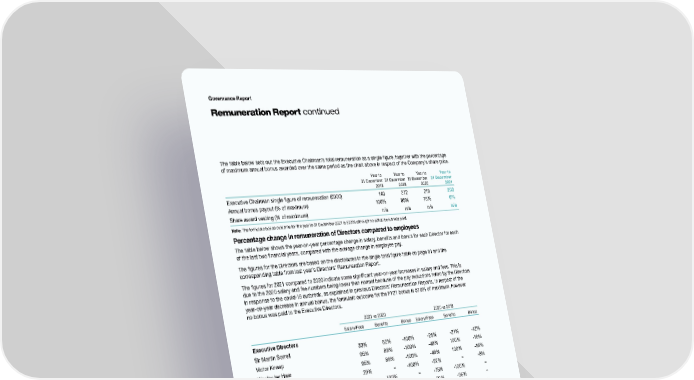 Governance Report Remuneration Report continued The table below sets out the Executive Chairman’s total remuneration as a single figure, together with the percentage of maximum annual bonus awarded over the same period as the chart above in respect of the Company’s share price. Year to Year to Year to Year to 31 December 31 December 31 December 31 December 2018 2019 2020 2021 Executive Chairman single figure of remuneration (£000) 140 272 218 203 Annual bonus payout (% of maximum) 100% 85% 75% 0% Share award vesting (% of maximum) n/a n/a n/a n/a Note: The formulaic bonus outcome for the year to 31 December 2021 is 57.5% although no actual bonus was paid. Percentage change in remuneration of Directors compared to employees The table below shows the year-on-year percentage change in salary, benefits and bonus for each Director for each of the last two financial years, compared with the average change in employee pay. The figures for the Directors are based on the disclosures in the single total figure table on page 81 and the corresponding table from last year’s Directors’ Remuneration Report. The figures for 2021 compared to 2020 indicate some significant year-on-year increases in salary and fees. This is due to the 2020 salary and fee numbers being lower than normal because of the pay reductions taken by the Directors in response to the covid-19 outbreak, as explained in previous Directors’ Remuneration Reports. In respect of the year-on-year decrease in annual bonus, the formulaic outcome for the FY21 bonus is 57.5% of maximum, however no bonus was paid to the Executive Directors. 2021 vs 2020 2020 vs 2019 Salary/Fees Benefits Bonus Salary/Fees Benefits Bonus Executive Directors Sir Martin Sorrell 33% 62% -100% -25% -21% -12% Victor Knaap 95% 88% -100% -48% 100% -16% Wesley ter Haar 95% 88% -100% -48% 100% -16% Peter Rademaker 29% – -100% -22% – -8% Pete Kim 278% 100% – -75% -100% – Christopher S. Martin 51% 1,500% – -36% -96% – 1 28% -5% -100% – – – Scott Spirit Non-Executive Directors Rupert Faure Walker 32% – – 35% – – Paul Roy 32% – – 35% – – Sue Prevezer 36% – – 13% – – Daniel Pinto 36% – – 13% – – Elizabeth Buchanan¹ 36% – – – – – 1 36% – – – – – Naoko Okumoto 1 Margaret Ma Connolly 36% – – – – – 1 – – – – – – Miles Young All UK Group employees2 5.7% -5.7% -67.4% 3% -16% 11% Notes: 1. Percentage change not shown for these Directors in certain periods as they did not serve for the full prior year. 2. Included to provide a more representative sample of the wider employee base in the United Kingdom (UK). 88 S4Capital Annual Report and Accounts 2021