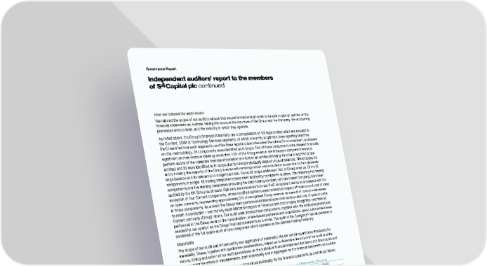 Governance Report Independent auditors’ report to the members 4 of S Capital plc continued How we tailored the audit scope We tailored the scope of our audit to ensure that we performed enough work to be able to give an opinion on the financial statements as a whole, taking into account the structure of the Group and the Company, the accounting processes and controls, and the industry in which they operate. As noted above, the Group’s financial statements are a consolidation of 126 legal entities which are included in the Content, DDM or Technology Services segments, of which one entity is split into three reporting branches. PwC identified that each legal entity and the three reporting branches meet the criteria for a component, and based on this methodology, 28 components were identified as in scope. Two of these components were deemed financially significant as their revenue made up more than 10% of the Group revenue. We instructed component teams to perform audits of the complete financial information of a further six entities (bringing the total to eight full scope entities) and 20 were identified as in scope due to having individually large or unusual balances. This includes the entity holding the majority of the Group’s external borrowings which was included in scope due to the individually large balance and its relevance to a significant risk. Our audit scope addressed 74% of Group revenue. Of the 28 components in scope, 18 trading components have been audited by component auditors. The remaining five trading components and five Holding companies (including the debt holding company and the Parent Company) have been audited by the UK Group audit team. Opinions were received from our PwC component teams as envisaged with the exception of four Content components, where modified opinions were received in respect of revenue and cost of sales on open contracts, representing approximately 5% of recognised Group revenue, as a result of control weaknesses in those components. As a result the Group team performed additional work over revenue and cost of sales in order to reach a conclusion – see the Key Audit Matter in respect of ‘Revenue and cost of sales recognition over time on Content contracts (Group)’ above. Our audit work across these components, together with the additional procedures performed at the Group level on the consolidation, share-based payments and acquisitions, gave us the evidence we needed for our opinion on the Group financial statements as a whole. The audit of the Company financial statements consisted of the full scope audit of one component which operates as the ultimate holding Company. Materiality The scope of our audit was influenced by our application of materiality. We set certain quantitative thresholds for materiality. These, together with qualitative considerations, helped us to determine the scope of our audit and the nature, timing and extent of our audit procedures on the individual financial statement line items and disclosures and in evaluating the effect of misstatements, both individually and in aggregate on the financial statements as a whole. Based on our professional judgment, we determined materiality for the financial statements as a whole as follows: Financial Statements – Group Financial Statements – Company Overall materiality £6.8 million (2020: £3.4 million). £9.0 million (2020: £7.0 million). How we determined it Approximately 1% of revenue. Approximately 1% of total assets. Rationale for Given the emphasis on growth, For the period, we believe that total assets benchmark applied particularly over revenues, we is the primary measure considered by considered total revenues to be the shareowners with respect to the primary measure of the performance Company’s results, and is a generally of the Group for the year ended accepted auditing benchmark. 31 December 2021. For each component in the scope of our Group audit, we allocated a materiality that is less than our overall Group materiality. The range of materiality allocated across components was between £0.5 million and £4.3 million. We use performance materiality to reduce to an appropriately low level the probability that the aggregate of uncorrected and undetected misstatements exceeds overall materiality. Specifically, we use performance materiality in determining the scope of our audit and the nature and extent of our testing of account balances, classes of transactions and disclosures, for example in determining sample sizes. Our performance materiality was 75% (2020: 75%) of overall materiality, amounting to £5.1 million (2020: £2.6 million) for the Group financial statements and £6.8 million (2020: £5.3 million) for the Company financial statements. In determining the performance materiality, we considered a number of factors – the history of misstatements, risk assessment and aggregation risk and the effectiveness of controls – and concluded that an amount at the upper end of our normal range was appropriate. We re-assessed this following the issues encountered within the Content segment as referred to in the Key Audit Matter ‘Revenue and cost of sales recognition over time on Content contracts (Group)’ above and concluded the original performance materiality remained appropriate in light of the additional procedures performed by the Group team over the six components where the control deficiencies were identified. 104 S4Capital Annual Report and Accounts 2021