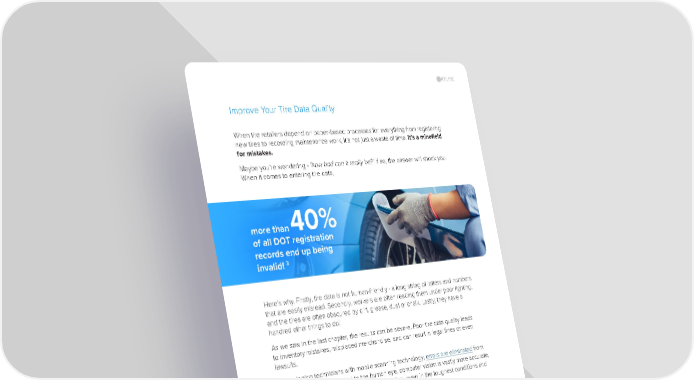 Improve Your Tire Data Quality When tire retailers depend on paper-based processes for everything from registering new tires to recording maintenance work, it’s not just a waste of time. It’s a minefield for mistakes. Maybe you’re wondering - ‘how bad can it really be?’ If so, the answer will shock you. When it comes to entering tire data, Here’s why. Firstly, tire data is not human-friendly - a long string of letters and numbers that are easily misread. Secondly, workers are often reading them under poor lighting, and the tires are often obscured by dirt, grease, dust or chalk. Lastly, they have a hundred other things to do! As we saw in the last chapter, the results can be severe. Poor tire data quality leads to inventory mistakes, misplaced merchandise, and can result in legal fines or even lawsuits. By equipping technicians with mobile scanning technology, errors are eliminated from these processes. Compared to the human eye, computer vision is vastly more accurate, delivering DOT reading with over 95% precision , even in the toughest conditions and when there is no internet connection. Having a handle on in-store data gives you the confidence of having: Real-time data updates on sales Full visibility and transparency. Instant, accurate tire registration Up-to-date tire inventories 12 more than 40% of all DOT registration records end up being invalid! 3