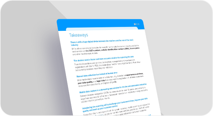18 Takeaways There is still a huge digital divide between tire retailers and the rest of the retail industry While others can rely on barcodes for everything, the data tire dealers need to provide the best service are tire DOT numbers, vehicle identification numbers (VINs), license plates and other hard-to-capture data Tire dealers need a faster and more accurate solution for capturing tire data From tire inspections and services, to inventory management and mandatory tire registrations with the NHTSA, tire dealerships need to have a tight handle on their data - but current processes mean they are held back Manual data collection is a hotbed of human error When technicians have to enter this data manually, it results in slower turnaround times, poor data quality, and legal risks from incorrect tire registration. All of these issues take resources from your teams, and siphon off profits. Mobile data capture is a pioneering new solution for the tire and automotive industries Optical character recognition (OCR) has been around for over 30 years, used primarily in large fixed scanners for office work. But recent innovations in mobile technology packs this solution into the palm of your hands. Introducing tire scanning will turbocharge your turnaround times, improve your data quality and level up your customer service Faster than the human eye and with far greater accuracy, mobile scanning can capture tire data in under 5 seconds, so you can service more vehicles, provide your staff with up-to- date information on each tire, and provide a personalized service to each customer. Using tire and vehicle data to build customer profiles delivers a quick win today, and pays dividends down the line Customers love the ‘wow’ factor of seeing technicians using the latest tech in store, but the real benefit comes when you can leverage this data to follow up with personalized reminders for services, special discounts and offers - and also ensure they receive the same service at every store in your network.