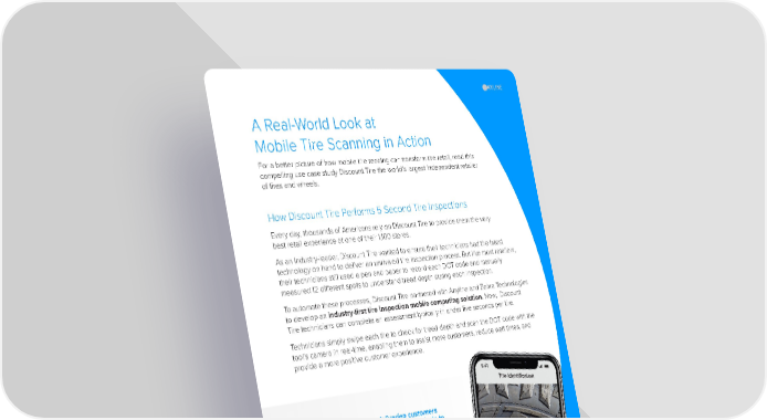 A Real-World Look at Mobile Tire Scanning in Action For a better picture of how mobile tire reading can transform tire retail, read this compelling use case study Discount Tire the world’s largest independent retailer of tires and wheels. “We pride ourselves on delivering customers the highest quality tire service and products to help keep them safe on the road. Our new tire inspection solution is a game-changer for our people and will help further our assurance to our customers that we are taking care of their safety by providing the best possible service and most accurate tire readings.” Tom Williams, Chief Experience Officer, Discount Tire How Discount Tire Performs 5 Second Tire Inspections Every day, thousands of Americans rely on Discount Tire to provide them the very best retail experience at one of their 1,100 stores. As an industry-leader, Discount Tire wanted to ensure their technicians had the latest technology on hand to deliver an unrivaled tire inspection process. But like most retailers, their technicians still used a pen and paper to record each DOT code and manually measured 12 different spots to understand tread depth during each inspection. To automate these processes, Discount Tire partnered with Anyline and Zebra Technologies to develop an industry-first tire inspection mobile computing solution. Now, Discount Tire technicians can complete an assessment typically in under five seconds per tire. Technicians simply swipe each tire to check for tread depth and scan the DOT code with the tool’s camera in real-time, enabling them to assist more customers, reduce wait times, and provide a more positive customer experience. 16