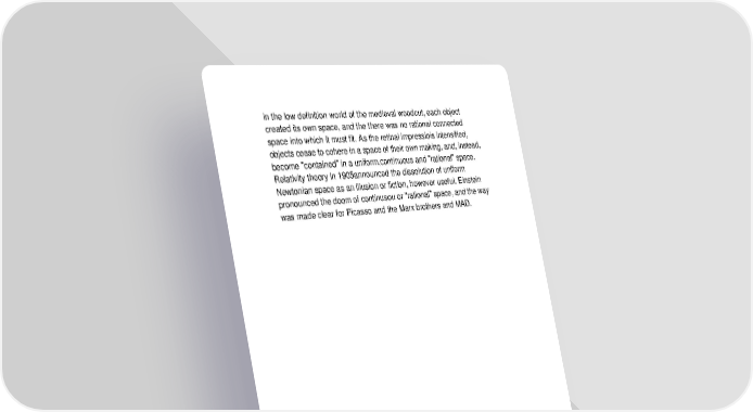in the low definition world of the medieval woodcut, each object created its own space, and the there was no rational connected space into which it must fit. As the retinal impressiois intensified, objects cease to cohere in a space of their own making, and, instead, become "contained" in a uniform,continuous and "rational" space. Relativity theory in 1905announced the dissolution of uniform Newtonian space as an illusion or fiction, however useful. Einstein pronounced the doom of continusou or "rational" space, and the way was made clear for Picasso and the Marx brothers and MAD.
