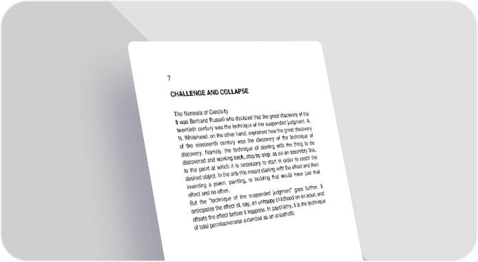 7 CHALLENGE AND COLLAPSE The Nemesis of Creativity It was Bertrand Russell who declared that the great discovery of the twentieth century was the technique of the suspended judgment. A. N. Whitehead, on the other hand, explained how the great discovery of the nineteenth century was the discovery of the technique of discovery. Namely, the technique of starting with the thing to be discovered and working back, step by step, as on an assembly line, to the point at which it is necessary to start in order to reach the desired object. In the arts this meant starting with the effect and then inventing a poem, painting, or building that would have just that effect and no other. But the "technique of the suspended judgment" goes further. It anticipates the effect of, say, an unhappy childhood on an adult, and offsets the effect before it happens. In psychiatry, it is the technique of total permissiveness extended as an anesthetic