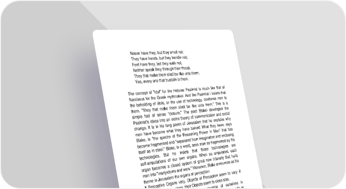 Noses have they, but they smell not; They have hands, but they handle not; Feet have they, but they walk not; Neither speak they through their throat. They that make them shall be like unto them; Yea, every one that trusteth in them. The concept of "idol" for the Hebrew Psalmist is much like that of Narcissus for the Greek mythmaker. And the Psalmist i insists that the beholding of idols, or the use of technology, conforms men to them. "They that make them shall be like unto them." This is a simple fact of sense "closure." The poet Blake! developed the Psalmist's ideas into an entire theory of communication and social change, It is in his long poem of Jerusalem that he explains why men have become what they have beheld What they have, says Blake, is "the spectre of the Reasoning Power in Man" that has become fragmented and "separated from Imagination and enclosing itself as in steel." Blake, in a word, sees man as fragmented by his technologies. But he insists that these technologies are self-amputations of our own organs. When so amputated, each organ becomes a closed system of great new intensity that hurls man into "martyrdoms and wars." Moreover, Blake announces as his theme in Jerusalem the organs of perception: If Perceptive Organs vary, Objects of Perception seem to vary: If Perceptive Organs close, their Objects seem to close also. To behold, use or perceive any extension of ourselves in tech-nological form is necessarily to embrace it. To listen to radio or to read the primed page is to accept these extensions of ourselves into our personal system and to undergo the "closure" or dis- placement of perception that follows automatically. It is this continuous embrace of our own technology in daily use that