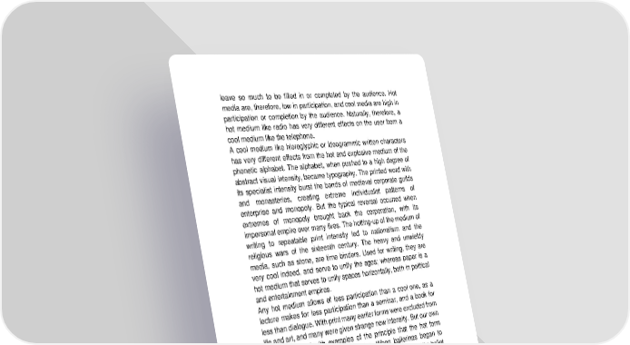 leave so much to be filled in or completed by the audience. Hot media are, therefore, low in participation, and cool media are high in participation or completion by the audience. Naturally, therefore, a hot medium like radio has very different effects on the user from a cool medium like the telephone. A cool medium like hieroglyphic or ideogrammic written characters has very different effects from the hot and explosive medium of the phonetic alphabet. The alphabet, when pushed to a high degree of abstract visual intensity, became typography. The printed word with its specialist intensity burst the bonds of medieval corporate guilds and monasteries, creating extreme individualist patterns of enterprise and monopoly. But the typical reversal occurred when extremes of monopoly brought back the corporation, with its impersonal empire over many lives. The hotting-up of the medium of writing to repeatable print intensity led to nationalism and the religious wars of the sixteenth century. The heavy and unwieldy media, such as stone, are time binders. Used for writing, they are very cool indeed, and serve to unify the ages; whereas paper is a hot medium that serves to unify spaces horizontally, both in political and entertainment empires. Any hot medium allows of less participation than a cool one, as a lecture makes for less participation than a seminar, and a book for less than dialogue. With print many earlier forms were excluded from life and art, and many were given strange new intensity. But our own time is crowded with examples of the principle that the hot form excludes, and the cool one includes. When ballerinas began to dance on their toes a century ago, it was felt that the art of the ballet had acquired a new "spirituality." With this new intensity, male figures were excluded from ballet. The role of women had also become fragmented with the advent of industrial specialism and the explosion of home functions into laundries, bakeries, and hospitals on the periphery of the community. Intensity or high definition engenders