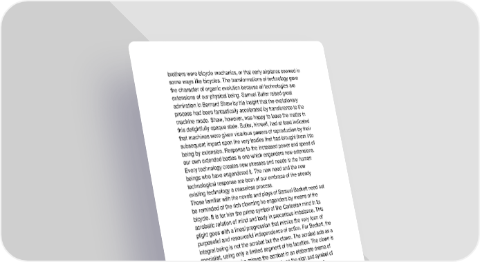 brothers were bicycle mechanics, or that early airplanes seemed in some ways like bicycles. The transformations of technology gave the character of organic evolution because all technologies are extensions of our physical being. Samuel Butler raised great admiration in Bernard Shaw by his insight that the evolutionary process had been fantastically accelerated by transference to the machine mode. Shaw, however, was happy to leave the matter in this delightfully opaque state. Butler, himself, had at least indicated that machines were given vicarious powers of reproduction by their subsequent impact upon the very bodies that had brought them into being by extension. Response to the increased power and speed of our own extended bodies is one which engenders new extensions. Every technology creates new stresses and needs in the human beings who have engendered it. The new need and the new technological response are born of our embrace of the already existing technology a ceaseless process. Those familiar with the novels and plays of Samuel Beckett need not be reminded of the rich clowning he engenders by means of the bicycle. It is for him the prime symbol of the Cartesian mind in its acrobatic relation of mind and body in precarious imbalance. This plight goes with a lineal progression that mimics the very form of purposeful and resourceful independence of action. For Beckett, the integral being is not the acrobat but the clown. The acrobat acts as a specialist, using only a limited segment of his faculties. The clown is the integral man who mimes the acrobat in an elaborate drama of incompetence. Beckett sees the bicycle as the sign and symbol of specialist futility in the present electric age, when we must all interact and react, using all of our faculties at once. Humpty-Dumpty is the familiar example of the clown unsuccessfully imitating the acrobat. Just because all the King's horses and all the King's men couldn't put Humpty-Dumpty together again, it doesn't follow that electromagnetic automation