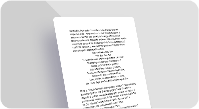 punctuality, their pedantic devotion to mechanical-time and sequential order. As space-time flooded through the gates of awareness from the new electric technology, all mechanical observance became distasteful and even ridiculous. Donne had the same ironic sense of the irrelevance of clock-time, but pretended that in the kingdom of love even the great cosmic cycles of time were also petty aspects of the clock: Busy old fool, unruly Sun, Why dost thou thus Through windows, and through curtains call on us? Must to thy motions lovers' seasons run? Saucy, pedantic wretch, go chide Late school-boys, and sour prentices, Co tell Court-huntsmen, that the King will ride, Call country ants to harvest offices, Love, all alike, no season knows nor clime, Nor hours, days, months, which are the rags of time. Much of Donne's twentieth-century vogue was due to his challenging the authority of the new Gutenberg age to invest him with the stigmata of uniform repeatable typography and with the motives of precise visual measurement. In like manner, Andrew Marvell's "To his Coy Mistress" was full of contempt for the new spirit of measurement and calculation of time and virtue: Had we but world enough and time, This coyness, lady, were no crime We would sit down and think which way To walk, and pass our long love's day. . . . An hundred years should go to praise Thine eyes, and on thy forehead gaze; Two hundred to adore each breast