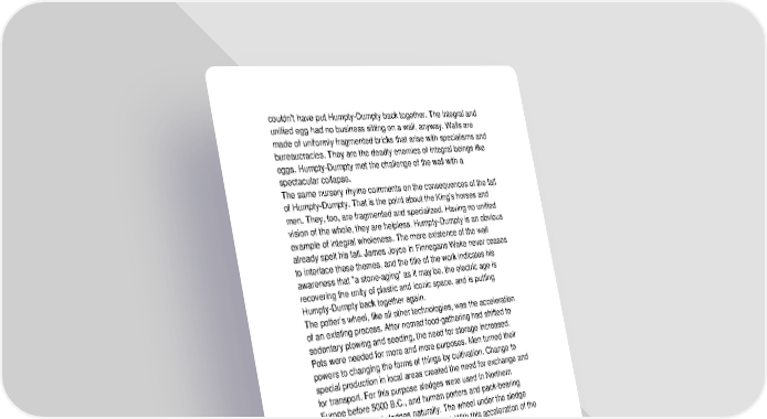 couldn't have put Humpty-Dumpty back together. The integral and unified egg had no business sitting on a wall, anyway. Walls are made of uniformly fragmented bricks that arise with specialisms and bureaucracies. They are the deadly enemies of integral beings like eggs. Humpty-Dumpty met the challenge of the wall with a spectacular collapse. The same nursery rhyme comments on the consequences of the fall of Humpty-Dumpty. That is the point about the King's horses and men. They, too, are fragmented and specialized. Having no unified vision of the whole, they are helpless. Humpty-Dumpty is an obvious example of integral wholeness. The mere existence of the wall already spelt his fall. James Joyce in Finnegans Wake never ceases to interlace these themes, and the title of the work indicates his awareness that "a stone-aging" as it may be, the electric age is recovering the unity of plastic and iconic space, and is putting Humpty-Dumpty back together again. The potter’s wheel, like all other technologies, was the acceleration of an existing process. After nomad food-gathering had shifted to sedentary plowing and seeding, the need for storage increased. Pots were needed for more and more purposes. Men turned their powers to changing the forms of things by cultivation. Change to special production in local areas created the need for exchange and for transport. For this purpose sledges were used in Northern Europe before 5000 B.C., and human porters and pack-bearing animals preceded sledges naturally. The wheel under the sledge was an accelerator of feet, not of hand. With this acceleration of the feet came the need for road, just as with the extension of our backsides in the form of chair, came the need for table. The wheel is an ablative absolute of feet, as chair is the ablative absolute of backside. But when such ablatives intrude, they alter the syntax of society. There is no ceteris paribus in the world of media and technology. Every extension or acceleration effects new configurations in the over-all situation at once.