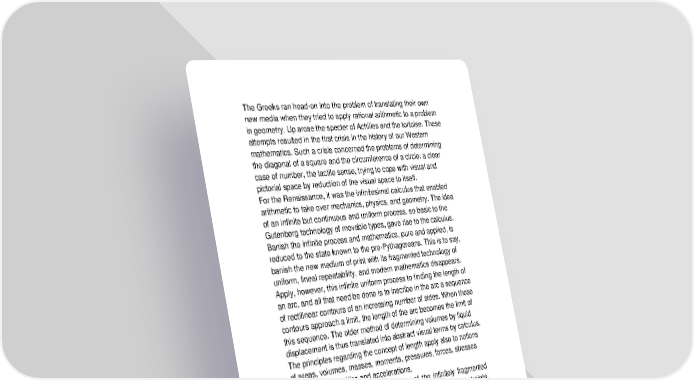 The Greeks ran head-on into the problem of translating their own new media when they tried to apply rational arithmetic to a problem in geometry. Up arose the specter of Achilles and the tortoise. These attempts resulted in the first crisis in the history of our Western mathematics. Such a crisis concerned the problems of determining the diagonal of a square and the circumference of a circle: a clear case of number, the tactile sense, trying to cope with visual and pictorial space by reduction of the visual space to itself. For the Renaissance, it was the infinitesimal calculus that enabled arithmetic to take over mechanics, physics, and geometry. The idea of an infinite but continuous and uniform process, so basic to the Gutenberg technology of movable types, gave rise to the calculus. Banish the infinite process and mathematics, pure and applied, is reduced to the state known to the pre-Pythagoreans. This is to say, banish the new medium of print with its fragmented technology of uniform, lineal repeatability, and modern mathematics disappears. Apply, however, this infinite uniform process to finding the length of an arc, and all that need be done is to inscribe in the arc a sequence of rectilinear contours of an increasing number of sides. When these contours approach a limit, the length of the arc becomes the limit of this sequence. The older method of determining volumes by liquid displacement is thus translated into abstract visual terms by calculus. The principles regarding the concept of length apply also to notions of areas, volumes, masses, moments, pressures, forces, stresses and strains, velocities and accelerations. The miracle-maker, the sheer function of the infinitely fragmented and repeatable, became the means of making visually flat, straight, and uniform all that was nonvisual: the skew, the curved, and the bumpy. In the same way, the phonetic alphabet had, centuries before, invaded the discontinuous cultures of the barbarians, and translated their sinuosities and obtusities into the uniformities of the visual culture of the Western world. It is
