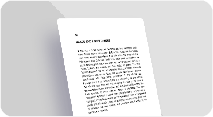 10 ROADS AND PAPER ROUTES It was not until the advent of the telegraph that messages could travel faster than a messenger. Before this, roads and the written word were closely interrelated. It is only since the telegraph that information has detached itself from such solid commodities as stone and papyrus, much as money had earlier detached itself from hides, bullion, and metals, and has ended as paper. The term "communication" has had an extensive use in connection with roads and bridges, sea routes, rivers, and canals, even before it became transformed into "information movement" in the electric age. Perhaps there is no more suitable way of defining the character of the electric age than by first studying the rise of the idea of transportation as communication, and then the transition of the idea from transport to information by means of electricity. The word "metaphor" is from the Greek meld plus pherein, to carry across or transport. In this book we are concerned with all forms of transport of goods and information, both as metaphor and exchange. Each form of transport not only carries, but translates and transforms, the sender, the receiver,