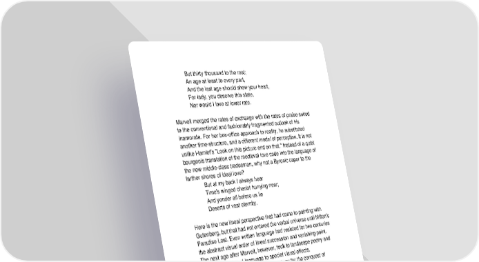 But thirty thousand to the rest; An age at least to every part, And the last age should show your heart, For lady, you deserve this state, Nor would I love at lower rate. Marvell merged the rates of exchange with the rates of praise suited to the conventional and fashionably fragmented outlook of his inamorata. For her box-office approach to reality, he substituted another time-structure, and a different model of perception. It is not unlike Hamlet's "Look on this picture and on that." Instead of a quiet bourgeois translation of the medieval love code into the language of the new middle-class tradesman, why not a Byronic caper to the farther shores of ideal love? But at my back I always hear Time's winged chariot hurrying near; And yonder all before us lie Deserts of vast eternity. Here is the new lineal perspective that had come to painting with Gutenberg, but that had not entered the verbal universe until Milton's Paradise Lost. Even written language had resisted for two centuries the abstract visual order of lineal succession and vanishing point. The next age after Marvell, however, took to landscape poetry and the subordination of language to special visual effects. But Marvell concluded his reverse strategy for the conquest of bourgeois clock-time with the observation Thus, though we cannot make our sun Stand still, yet we will make him run. He proposed that his beloved and he should transform