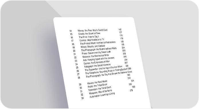 14 Money: the Poor Man's Credit Card 142 15 Clocks: the Scent of Time 157 16 The Print: How to Dig it 170 17 Comics: Mad Vestibule to TV 178 18 The Printed Word: Architect of Nationalism 185 19 Wheel, Bicycle, and Airplane 195 20 The Photograph: the Brothel-without-Walls 204 21 Press: Government by News Leak 220 22 Motorcar: the Mechanical Bride 236 23 Ads: Keeping Upset with the Joneses 246 24 Games: the Extensions of Man 254 25 Telegraph: the Social Hormone 267 26 The Typewriter: into the Age of the Iron Whim 281 27 The Telephone: Sounding Brass or TinklingSymbol? 289 28 The Phonograph: the Toy that Shrank the National Chest 300 29 Movies: the Reel World 310 30 Radio: the Tribal Drum 324 31 Television: the Timid Giant 336 32 Weapons: War of the Icons 369 33 Automation: Learning a Living 378