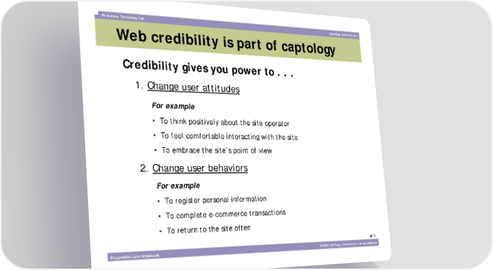 Persuasive Technology Lab captology.stanford.edu Web credibility is part of captology Credibility gives you power to . . . 1. Change user attitudes For example • To think positively about the site operator • To feel comfortable interacting with the site • To embrace the site’s point of view 2. Change user behaviors For example • To register personal information • To complete e-commerce transactions • To return to the site often #11 Prepared for Luke Wroblewski ©2003, BJ Fogg. Commercial use not allowed.