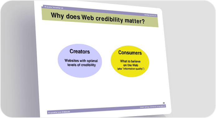 Persuasive Technology Lab captology.stanford.edu Why does Web credibility matter? Creators Consumers Websites with optimal What to believe levels of credibility on the Web (aka “information quality”) #9 Prepared for Luke Wroblewski ©2003, BJ Fogg. Commercial use not allowed.