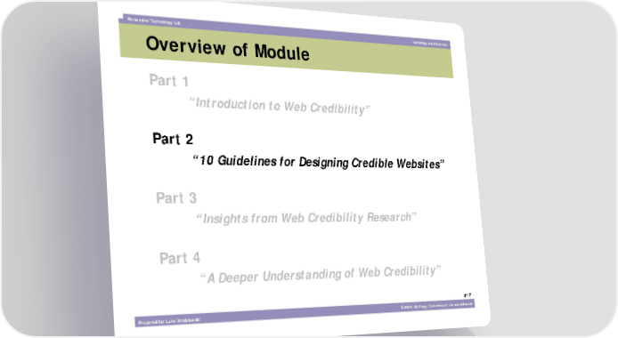 Persuasive Technology Lab captology.stanford.edu Overview of Module Part 1 “Introduction to Web Credibility” Part 2 “10 Guidelines for Designing Credible Websites” Part 3 “Insights from Web Credibility Research” Part 4 “A Deeper Understanding of Web Credibility” #17 Prepared for Luke Wroblewski ©2003, BJ Fogg. Commercial use not allowed.