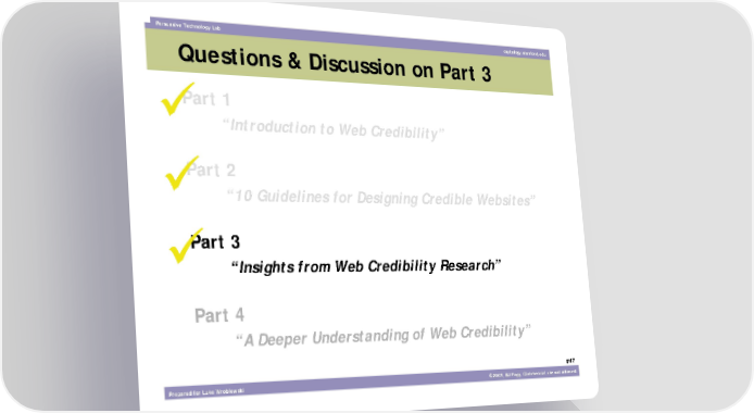 Persuasive Technology Lab captology.stanford.edu Questions & Discussion on Part 3 Part 1 9 “Introduction to Web Credibility” Part 2 9 “10 Guidelines for Designing Credible Websites” Part 3 9 “Insights from Web Credibility Research” Part 4 “A Deeper Understanding of Web Credibility” #47 Prepared for Luke Wroblewski ©2003, BJ Fogg. Commercial use not allowed.