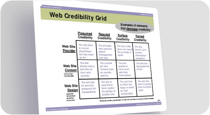 Persuasive Technology Lab captology.stanford.edu Web Credibility Grid Examples of elements Grid with examples that decrease credibility* Presumed Reputed Surface Earned Credibility Credibility Credibility Credibility Web Site The site tries The provider The site’s URL The site Provider to recruit was sued for does not match doesn’t give advertisers patent the provider’s contact but has none infringement name. information so far. and lost. anywhere. The site The content The site The site has Web Site shows only a got bad seems to typographical Content few hits on reviews from have more errors. •information their web an outside ads than •functionality counter. agency. information. The site has The site is The text font The site has Web Site no security reported to is either too links to pages Design protocols for have copied large or small that no longer •aesthetic transactions. the design of to read exist. •information another site. comfortably. •technical •interaction *These are working hypotheses. To date, we’ve studied only some of these variables. #69 Prepared for Luke Wroblewski ©2003, BJ Fogg. Commercial use not allowed.