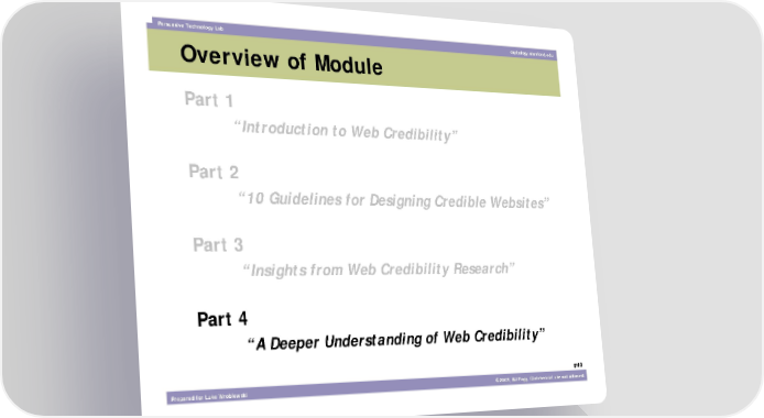 Persuasive Technology Lab captology.stanford.edu Overview of Module Part 1 “Introduction to Web Credibility” Part 2 “10 Guidelines for Designing Credible Websites” Part 3 “Insights from Web Credibility Research” Part 4 “A Deeper Understanding of Web Credibility” #48 Prepared for Luke Wroblewski ©2003, BJ Fogg. Commercial use not allowed.