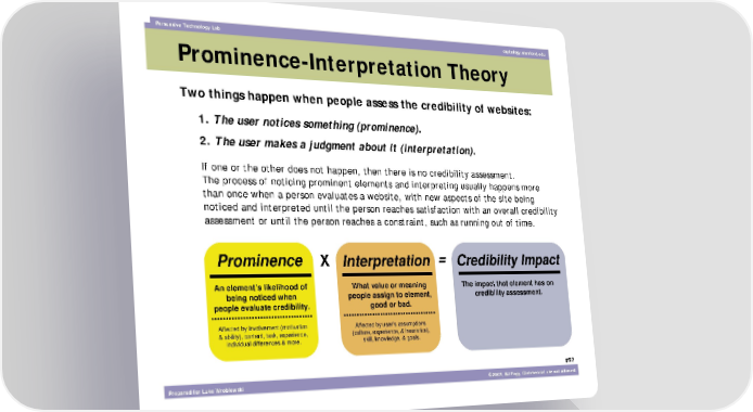 Persuasive Technology Lab captology.stanford.edu Prominence-Interpretation Theory Two things happen when people assess the credibility of websites: 1. The user notices something (prominence). 2. The user makes a judgment about it (interpretation). If one or the other does not happen, then there is no credibility assessment. The process of noticing prominent elements and interpreting usually happens more than once when a person evaluates a website, with new aspects of the site being noticed and interpreted until the person reaches satisfaction with an overall credibility assessment or until the person reaches a constraint, such as running out of time. Prominence X Interpretation = Credibility Impact An element’s likelihood of What value or meaning The impact that element has on being noticed when people assign to element, credibility assessment. people evaluate credibility. good or bad. Affected by involvement (motivation Affected by user’s assumptions & ability), content, task, experience, (culture, experience, & heuristics), individual differences & more. skill, knowledge, & goals. #52 Prepared for Luke Wroblewski ©2003, BJ Fogg. Commercial use not allowed.