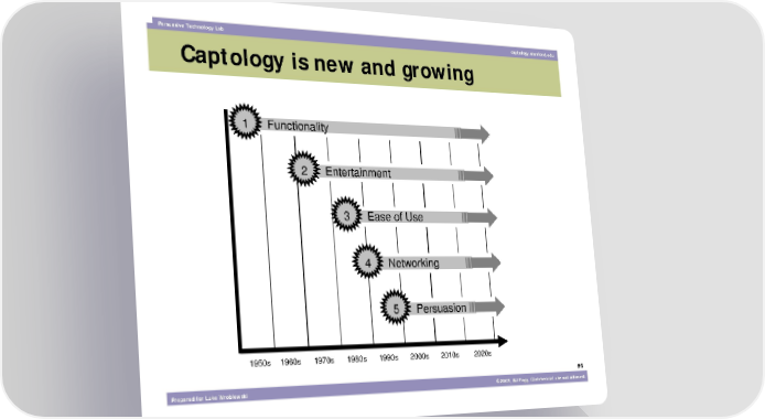 Persuasive Technology Lab captology.stanford.edu Captology is new and growing 1 Functionality 2 Entertainment 3 Ease of Use 4 Networking 5 Persuasion 1950s 1960s 1970s 1980s 1990s 2000s 2010s 2020s #6 Prepared for Luke Wroblewski ©2003, BJ Fogg. Commercial use not allowed.