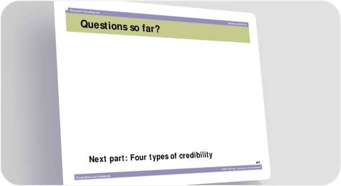 What Makes a Website Credible? Page 53 Page 55Persuasive Technology Lab captology.stanford.edu Questions so far? Next part: Four types of credibility #54 Prepared for Luke Wroblewski ©2003, BJ Fogg. Commercial use not allowed.