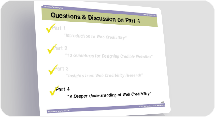 Persuasive Technology Lab captology.stanford.edu Questions & Discussion on Part 4 Part 1 9 “Introduction to Web Credibility” Part 2 9 “10 Guidelines for Designing Credible Websites” Part 3 9 “Insights from Web Credibility Research” Part 4 9 “A Deeper Understanding of Web Credibility” #70 Prepared for Luke Wroblewski ©2003, BJ Fogg. Commercial use not allowed.