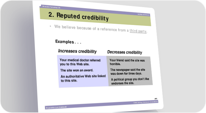 Persuasive Technology Lab captology.stanford.edu 2. Reputed credibility • We believe because of a reference from a third party. Examples . . . Increases credibility Decreases credibility Your medical doctor referred Your friend said the site was you to this Web site. horrible. The site won an award. The newspaper said the site An authoritative Web site linked was down for three days. to this site. A political group you don’t like endorses the site. #59 Prepared for Luke Wroblewski ©2003, BJ Fogg. Commercial use not allowed.