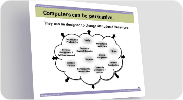 Persuasive Technology Lab captology.stanford.edu Computers can be persuasive. They can be designed to change attitudes & behaviors. #4 Prepared for Luke Wroblewski ©2003, BJ Fogg. Commercial use not allowed.