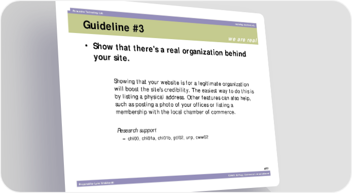 Persuasive Technology Lab captology.stanford.edu Guideline #3 we are real • Show that there's a real organization behind your site. Showing that your website is for a legitimate organization will boost the site's credibility. The easiest way to do this is by listing a physical address. Other features can also help, such as posting a photo of your offices or listing a membership with the local chamber of commerce. Research support – chi00, chi01a, chi01b, ptl02, unp, cww02 #22 Prepared for Luke Wroblewski ©2003, BJ Fogg. Commercial use not allowed.