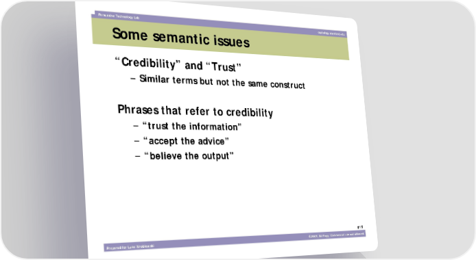 Persuasive Technology Lab captology.stanford.edu Some semantic issues “Credibility” and “Trust” – Similar terms but not the same construct Phrases that refer to credibility – “trust the information” – “accept the advice” – “believe the output” #15 Prepared for Luke Wroblewski ©2003, BJ Fogg. Commercial use not allowed.