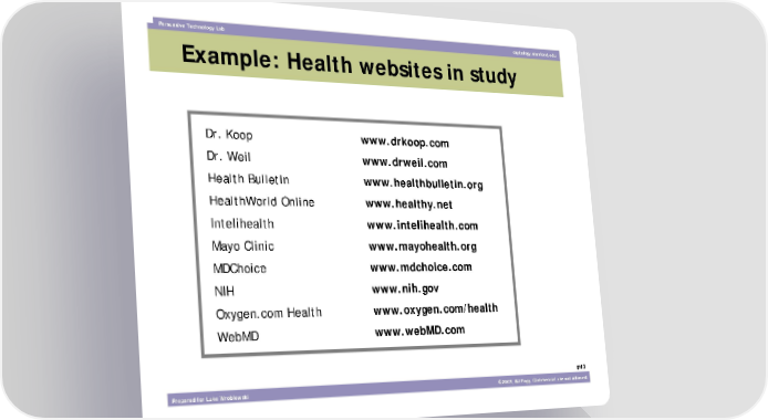 Persuasive Technology Lab captology.stanford.edu Example: Health websites in study Dr. Koop www.drkoop.com Dr. Weil www.drweil.com Health Bulletin www.healthbulletin.org HealthWorld Online www.healthy.net Intelihealth www.intelihealth.com Mayo Clinic www.mayohealth.org MDChoice www.mdchoice.com NIH www.nih.gov Oxygen.com Health www.oxygen.com/health WebMD www.webMD.com #43 Prepared for Luke Wroblewski ©2003, BJ Fogg. Commercial use not allowed.