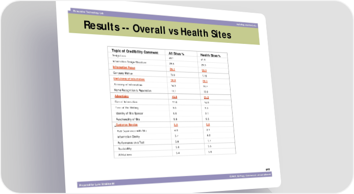 Persuasive Technology Lab captology.stanford.edu Results -- Overall vs Health Sites Topic of Credibility Comment All Sites % Health Sites % Design Look 46.1 41.8 Information Design/Structure 28.5 28.3 Information Focus 25.1 33.0 Company Motive 15.5 17.8 Usefulness of Information 14.8 20.5 Accuracy of Information 14.3 18.7 Name Recognition & Reputation 14.1 10.9 Advertising 13.8 21.3 Bias of Information 11.6 14.8 Tone of the Writing 9.0 8.3 Identity of Site Sponsor 8.8 9.1 Functionality of Site 8.6 8.3 Customer Service 6.4 0.4 Past Experience with Site 4.6 2.1 Information Clarity 3.7 6.0 Performance on a Test 3.6 1.7 Readability 3.6 3.5 Affiliations 3.4 5.6 #46 Prepared for Luke Wroblewski ©2003, BJ Fogg. Commercial use not allowed.