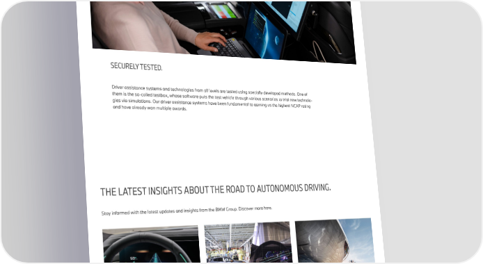 When it comes to autonomous driving, safety is our top priority. This means the focus is not just on developing safety-critical systems but also on monitoring and testing the relevant technologies. For customers to place their trust in our automated driving systems, safety is essential. And that’s why every detail of every innovation is tested and tested again. Because we want drivers to have complete confidence in their cars. SAFELY TO THE DRIVING EXPERIENCE OF THE FUTURE. SECURELY TESTED. Driver assistance systems and technologies from all levels are tested using specially developed methods. One of them is the so-called testbox, whose software puts the test vehicle through various scenarios to trial new technolo- gies via simulations. Our driver assistance systems have been fundamental to earning us the highest NCAP rating and have already won multiple awards. THE LATEST INSIGHTS ABOUT THE ROAD TO AUTONOMOUS DRIVING. Stay informed with the latest updates and insights from the BMW Group. Discover more here. BMW GROUP SETS NEW STANDARDS IN AUTOMATED DRIVING. DRIVERLESS IN PRODUCTION. MORE NEWS. LEARN MORE.