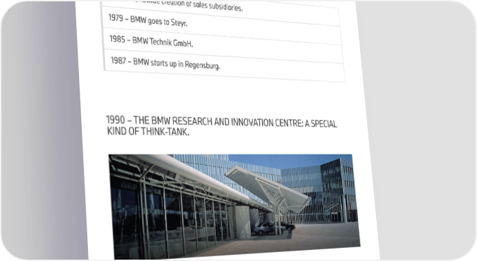 Starting in 1970, BMW began building an administrative tower block in the north of Munich. Its un- usual shape soon led to it to be known as the "four-cylinder building", and it soon became a notable landmark in the city's architecture. The BMW Museum was installed next to it in a bowl-shaped building that is still one of a kind to this day. The new building complex was officially opened on 18 May 1973. 1973 – Worldwide creation of sales subsidiaries. 1979 – BMW goes to Steyr. 1985 – BMW Technik GmbH. 1987 – BMW starts up in Regensburg. In 1986, BMW AG brought together all research and development work under one roof at the Forschungs- und Innovationszentrum (Research and Innovation Centre, or FIZ) in Munich. It became the first automotive manufacturer to establish such an institution, with around 7,000 scientists, en- gineers, designers, managers and technicians, working together as part of an integrated team. The facility was officially opened on 27 April 1990. In 2004, the FIZ was expanded with the addition of the Projekthaus building. Incorporating the principles of “construction communications”, the devel- 1990 – THE BMW RESEARCH AND INNOVATION CENTRE: A SPECIAL KIND OF THINK-TANK.