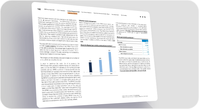 146 BMW Group Report 2024 To Our Stakeholders Combined Management Report Group Financial Statements Responsibility Statement and Auditor’s Report Remuneration Report Other Information Sustainability Statement Extensive repair manuals and documentation are made availa- ble to all specialist workshops. The BMW Group provides a benchmark catalogue which can be used to categorise damage. This provides guidance on whether and how repairs can be con- ducted, including the tools required. This catalogue can be used in combination with a visual inspection or measurement technol- ogy. A comprehensive vehicle diagnostic system can be used to pinpoint the cause of issues in connected electronic and electrical components. This makes it possible to get vehicles back on the road by replacing individual parts. Specialised spare parts for motorcycles (such as pistons and connecting rods) are provided to simplify complex repairs and significantly reduce repair times. The ease with which products can be repaired also has an impact on their ↗ expected durability. According to the BMW Group’s end- of-life vehicle statistics, the average age of automobiles volun- tarily returned to recycling centres is around 21.5 years. The in- dustry average is around 18 years, according to an analysis by the German Federal Environment Agency. The longevity of the vehicles produced is based on a number of pillars, which are described below: In order to maximise the useful life of its products, the BMW Group offers protection against the cost of unexpected re- pairs, such as the BMW 2+1 warranty for 36 months and other warranty services. BMW customers in Europe benefit from the fact that defects can be fixed under warranty at the original retail partner, or any other BMW Group recognised partner in the ser- vice network. In addition to the statutory warranty obligations, the BMW Group has given customers worldwide the right to have defects rectified in the event of corrosion within twelve years of the start of the quality period since 2004. The BMW Group also attaches particular importance to ensuring the long-term availa- bility of spare parts to keep customers’ cars on the road and make sure that they retain their value over a long period of time. The BMW Group currently offers several hundred thousand dif- ferent spare parts for automobiles and motorbikes. In addition, Condition Based Services (CBS) uses sensors and special algo- rithms to monitor the condition of every BMW Group car. De- pending on the customer's driving profile, the service life of maintenance components can thus be optimally utilised. Effective waste management Waste management is part of the BMW Group’s holistic ap- proach to a circular economy and the environmental manage- ment system at its own production sites. Reducing the amount of waste for disposal per vehicle produced is an objective of the BMW Group’s environmental policy. The BMW Group intends to reduce the amount of waste for disposal per vehicle produced by 25% by 2030 compared to the base year 2016. No material im- pacts, risks or opportunities related to this topic have been iden- tified for our own operations. The relevant disclosures are there- fore provided in addition to ESRS on the basis of SASB, ↗ SASB Index. Waste for disposal per vehicle produced (automotive)1, 2 In the reporting period, a total of 868,084 t of the waste gener- ated in production was recycled or recovered (2023: 922,554 t)1. Of the total volume of waste, 91.7%1 (800,582 t) was recycled (material recovery) and 7.7%1 (67,502 t) was ther- mally recovered. ↗ The amount of waste for disposal per vehicle produced fell significantly by –20.8% year on year to 1.68 kg (2023: 2.12 kg).1 Waste generated by production1, 2 in t 2024 Total waste 872,976 Waste for recovery 868,084 Share of material recovery (in %) 91.7 Share of thermal recovery (in %) 7.7 Waste for disposal 4,892 Share of disposed waste (in %) 0.6 The BMW Group is also committed to the responsible use of re- sources within the supply chain. Established processes and ac- tions help to minimise the material impacts identified here. All relevant policies, actions and targets for mitigating and manag- ing impacts identified as material in the upstream value chain are identified as part of the due diligence process for upholding en- vironmental and social standards within the supplier network. ↗ Social and Environmental Responsibility in the Supplier Network 1 Additional disclosure, based on SASB ↗ SASB Index. 2 Additional information is available in ↗ Glossary and Explanation of Key Figures. 1.68 2.12 3.51 0 2024 2023 2016