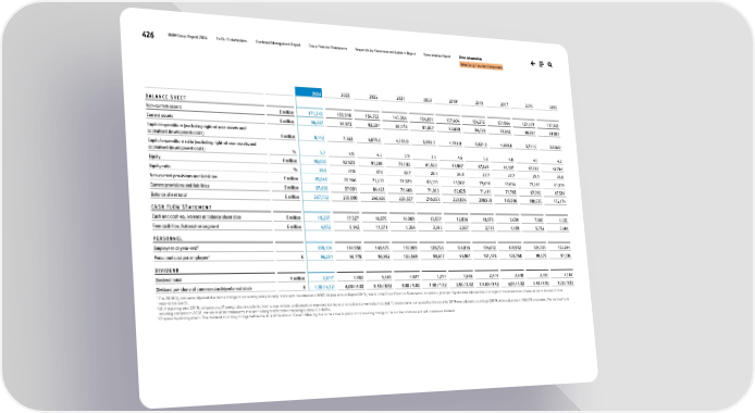 426 BMW Group Report 2024 To Our Stakeholders Combined Management Report Group Financial Statements Responsibility Statement and Auditor’s Report Remuneration Report Other Information BMW Group Ten-Year Comparison 2024 2023 2022 2021 2020 2019¹ 2018 2017 2016 2015 B A L A N C E S H E E T Non-current assets € million 171,345 155,918 154,722 143,354 134,851 137,404 124,202 121,964 121,671 110,343 Current assets € million 96,387 94,972 92,204 86,173 81,807 90,630 84,736 73,542 66,864 61,831 Capital expenditure (excluding right-of-use-assets and capitalised development costs) € million 8,142 7,563 6,075.0 4,391.0 3,593.0 4,791.0 5,029.0 4,688.0 3,731.0 3,826.0 Capital expenditure ratio (excluding right-of-use-assets and capitalised development costs) % 5.7 4.9 4.3 3.9 3.6 4.6 5.2 4.8 4.0 4.2 Equity € million 95,003 92,923 91,288 75,132 61,520 59,907 57,829 54,107 47,363 42,764 Equity ratio % 35.5 37.0 37.0 32.7 28.4 26.3 27.7 27.7 25.1 24.8 Non-current provisions and liabilities € million 85,040 70,966 71,217 77,929 83,175 85,502 79,698 69,634 73,183 63,819 Current provisions and liabilities € million 87,689 87,001 84,421 76,466 71,963 82,625 71,411 71,765 67,989 65,591 Balance sheet total € million 267,732 250,890 246,926 229,527 216,658 228,034 208,938 195,506 188,535 172,174 C A S H F L O W S T A T E M E N T Cash and cash equivalents at balance sheet date € million 19,287 17,327 16,870 16,009 13,537 12,036 10,979 9,039 7,880 6,122 Free cash flow Automotive segment € million 4,852 6,942 11,071 6,354 3,395 2,567 2,713 4,459 5,792 5,404 P E R S O N N E L Employees at year-end2 159,104 154,950 149,475 118,909 120,726 126,016 134,682 129,932 124,729 122,244 Personnel cost per employee2 € 96,251 96,778 94,952 103,569 99,647 98,901 101,178 100,760 99,575 97,136 D I V I D E N D Dividend total € million 2,6773 3,802 5,481 3,827 1,253 1,646 2,303 2,630 2,300 2,102 Dividend per share of common stock/preferred stock € 4,30 / 4,323 6,00 / 6.02 8.50 / 8.52 5.80 / 5.82 1.90 / 1.92 2.50 / 2.52 3.5.00 / 3.52 4,00 / 4.02 3.50 / 3.52 3.20 / 3.22 1 The 2018 figures were adjusted due to the change in accounting policy in conjunction with the adoption of IFRS 16 (see Annual Report 2019, note 6 to the Group Financial Statements). In addition, prior year figures were adjusted due to changes in the presentation of selected items that are of minor importance overall. 2 Until reporting year 2019, temporary staff, postgraduate students, interns, apprentices, and people on extended sick leave or on sabbatical were also included. To enable better comparability, the value for 2019 was adjusted accordingly (2019 before adjustment: 133,778 employees). For the timeframe including and prior to 2018, the share of the employees that are no longer reflected in reporting is about 7.5-8.0%. 3 Proposal by management. The dividend total may change before the date of the Annual General Meeting due to the share buyback and a resulting change in the number of shares entitled to receive a dividend.