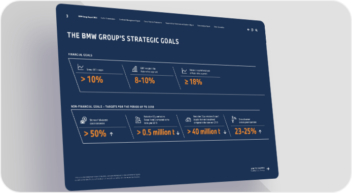 3 BMW Group Report 2024 To Our Stakeholders Combined Management Report Group Financial Statements Responsibility Statement and Auditor’s Report Remuneration Report Other Information FINANCIAL GOALS Group EBT margin EBIT margin in the Automotive segment Return on capital employed of Automotive segment > 10% 8-10% ≥ 18% NON-FINANCIAL GOALS – TARGETS FOR THE PERIOD UP TO 2030 Shares of all-electric cars in deliveries Reduction CO2e emissions Scope 1 and 2 compared to the base year 2019 Reduction CO2e emissions Scope 3 (supply chain and use phase) compared to the base year 2019 Share of women in management positions > 50% > 0.5 million t > 40 million t 23-25% THE BMW GROUP’S STRATEGIC GOALS This is a simplified presentation of the data. Detailed information on the performance figures LINK TO CHAPTER as well as the identification of the depth of the audit can be found in the respective chapters. The BMW Group Strategy