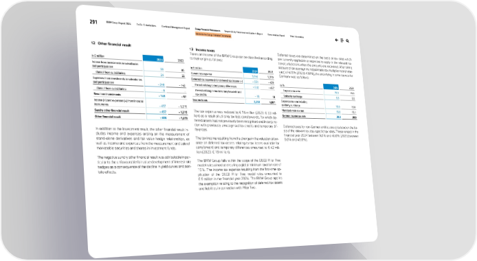 291 BMW Group Report 2024 To Our Stakeholders Combined Management Report Group Financial Statements Responsibility Statement and Auditor’s Report Remuneration Report Other Information Notes to the Group Financial Statements 12 Other financial result in € million 2024 2023 Income from investments in subsidiaries and participations 99 85 thereof from subsidiaries: 24 22 Expenses from investments in subsidiaries and participations – 248 – 142 thereof from subsidiaries: – 6 – Result on investments – 149 – 57 Income (+) and expenses (–) from financial instruments – 457 – 1,215 Sundry other financial result – 457 – 1,215 Other financial result – 606 – 1,272 In addition to the investment result, the other financial result in- cludes income and expenses arising on the measurement of stand-alone derivatives and fair value hedge relationships, as well as income and expenses from the measurement and sale of marketable securities and shares in investment funds. The negative sundry other financial result was attributable in par- ticular to the unfavourable fair value development of interest rate hedges as a consequence of the decline in yield curves and port- folio effects. 13 Income taxes Taxes on income of the BMW Group can be classified according to their origin as follows: in € million 2024 2023 Current tax expense 3,844 5,370 Deferred tax expense (+) / deferred tax income (–) – 551 – 439 thereof relating to temporary differences – 532 – 457 thereof relating to tax loss carryforwards and tax credits – 19 18 Income taxes 3,293 4,931 The tax expense was reduced by € 16 million (2023: € 33 mil- lion) as a result of utilising tax loss carryforwards, for which de- ferred assets had not previously been recognised and in conjunc- tion with previously unrecognised tax credits and temporary dif- ferences. The tax income resulting from the change in the valuation allow- ance on deferred tax assets relating to tax losses available for carryforward and temporary differences amounted to € 42 mil- lion (2023: € 19 million). The BMW Group falls within the scope of the OECD Pillar Two model rules aimed at ensuring a global minimum taxation rate of 15%. The income tax expense resulting from the first-time ap- plication of the OECD Pillar Two model rules amounted to € 9 million in the financial year 2024. The BMW Group applies the exemption relating to the recognition of deferred tax assets and liabilities in connection with Pillar Two. Deferred taxes are determined on the basis of tax rates which are currently applicable or expected to apply in the relevant na- tional jurisdictions when the amounts are recovered. After taking account of an average municipal trade tax multiplier rate (Hebe- satz) of 429% (2023: 430%), the underlying income tax rate for Germany was as follows: in % 2024 2023 Corporate tax rate 15.0 15.0 Solidarity surcharge 5.5 5.5 Corporate tax rate including solidarity surcharge 15.8 15.8 Municipal trade tax rate 15.0 15.1 German income tax rate 30.8 30.9 Deferred taxes for non-German entities are calculated on the ba- sis of the relevant country-specific tax rates. These ranged in the financial year 2024 between 9.0% and 40.0% (2023: between 9.0% and 40.0%).