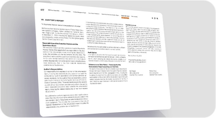 417 BMW Group Report 2024 To Our Stakeholders Combined Management Report Group Financial Statements Responsibility Statement and Auditor’s Report Remuneration Report Other Information VII. Auditor‘s Report VII. AUDITOR’S REPORT To Bayerische Motoren Werke Aktiengesellschaft, München We have audited the remuneration report of Fehler! Keine Doku- mentvariable verfügbar., Fehler! Unbekannter Name für Doku- ment-Eigenschaft., for the financial year from January , 2024 1 to December 31, 2024 including the related disclosures, which was prepared to comply with § [Article] 162 AktG [Aktiengesetz: German Stock Corporation Act]. Responsibilities of the Executive Directors and the Supervisory Board The executive directors and the supervisory board of Bayerische Motoren Werke Aktiengesellschaft are responsible for the prep- aration of the remuneration report, including the related disclo- sures, that complies with the requirements of § 162 AktG. The executive directors and the supervisory board are also responsi- ble for such internal control as they determine is necessary to enable the preparation of a remuneration report, including the re- lated disclosures, that is free from material misstatement, whether due to fraud or error. Auditor’s Responsibilities Our responsibility is to express an opinion on this remuneration report, including the related disclosures, based on our audit. We conducted our audit in accordance with German generally ac- cepted standards for the audit of financial statements promul- gated by the Institut der Wirtschaftsprüfer (Institute of Public Au- ditors in Germany) (IDW). Those standards require that we com- ply with ethical requirements and plan and perform the audit to obtain reasonable assurance about whether the remuneration report, including the related disclosures, is free from material misstatement. An audit involves performing procedures to obtain audit evidence about the amounts including the related disclosures stated in the remuneration report. The procedures selected depend on the au- ditor's judgment. This includes the assessment of the risks of material misstatement of the remuneration report including the related disclosures, whether due to fraud or error. In making those risk assessments, the auditor considers internal control relevant to the preparation of the remuneration report in- cluding the related disclosures. The objective of this is to plan and perform audit procedures that are appropriate in the circum- stances, but not for the purpose of expressing an opinion on the effectiveness of the company's internal control. An audit also in- cludes evaluating the appropriateness of accounting policies used and the reasonableness of accounting estimates made by the executive directors and the supervisory board, as well as evaluating the overall presentation of the remuneration report in- cluding the related disclosures. We believe that the audit evidence we have obtained is sufficient and appropriate to provide a basis for our audit opinion. Audit Opinion In our opinion, based on the findings of our audit, the remunera- tion report for the financial year from January 1, 2024, to Decem- ber 31, 2024, including the related disclosures, complies in all material respects with the accounting provisions of § 162 AktG. Reference to an Other Matter – Formal Audit of the Remuneration Report according to § 162 AktG The audit of the content of the remuneration report described in this auditor's report includes the formal audit of the remuneration report required by § 162 Abs. [paragraph] 3 AktG, including the issuance of a report on this audit. As we express an unqualified audit opinion on the content of the remuneration report, this audit opinion includes that the information required by § 162 Abs. 1 and 2 AktG has been disclosed in all material respects in the re- muneration report. Restriction on use We issue this auditor’s report on the basis of the engagement agreed with Fehler! Keine Dokumentvariable verfügbar., Mün- chen. The audit has been performed only for purposes of the company and the auditor‘s report is solely intended to inform the company as to the results of the audit. Our responsibility for the audit and for our auditor’s report is only towards the company in accordance with this engagement. The auditor’s report is not in- tended for any third parties to base any (financial) decisions thereon. We do not assume any responsibility, duty of care or li- ability towards third parties; no third parties are included in the scope of protection of the underlying engagement. § 334 BGB [Bürgerliches Gesetzbuch: German Civil Code], according to which objections arising from a contract may also be raised against third parties, is not waived. Munich, March 13, 2025 PricewaterhouseCoopers GmbH Wirtschaftsprüfungsgesellschaft Ralf Räpple Michael Popp Wirtschaftsprüfer Wirtschaftsprüfer (German Public Auditor) (German Public Auditor)