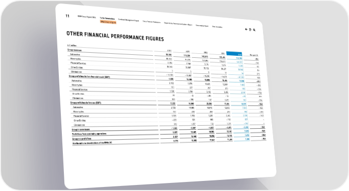 11 BMW Group Report 2024 To Our Stakeholders Combined Management Report Group Financial Statements Responsibility Statement and Auditor’s Report Remuneration Report Other Information BMW Group in Figures OTHER FINANCIAL PERFORMANCE FIGURES in € million 2020 2021 2022 2023 2024 Change in % Group revenues 98,990 111,239 142,610 155,498 142,380 – 8.4 Automotive 80,853 95,476 123,602 132,277 124,917 – 5.6 Motorcycles 2,284 2,748 3,176 3,214 3,220 0.2 Financial Services 30,044 32,867 35,122 36,227 38,562 6.4 Other Entities 3 5 8 11 14 27.3 Eliminations – 14,194 – 19,857 – 19,298 – 16,231 – 24,333 49.9 Group profit/loss before financial result (EBIT) 4,830 13,400 13,999 18,482 11,509 – 37.7 Automotive 2,162 9,870 10,635 12,981 7,893 – 39.2 Motorcycles 103 227 257 259 198 – 23.6 Financial Services 1,721 3,701 3,163 3,055 2,511 – 17.8 Other Entities 36 – 8 – 203 – 13 – 25 92.3 Eliminations 808 – 390 147 2,200 932 – 57.6 Group profit/loss before tax (EBT) 5,222 16,060 23,509 17,096 10,971 – 35.8 Automotive 2,722 11,805 18,918 12,642 7,544 – 40.3 Motorcycles 100 228 269 258 198 – 23.3 Financial Services 1,725 3,753 3,205 2,962 2,538 – 14.3 Other Entities – 235 531 995 – 100 837 – Eliminations 910 – 257 122 1,334 – 146 – Group income taxes – 1,365 – 3,597 – 4,927 – 4,931 – 3,293 – 33.2 Profit/loss from continuing operations 3,857 12,463 18,582 12,165 7,678 – 36.9 Group net profit/loss 3,857 12,463 18,582 12,165 7,678 – 36.9 Attributable to shareholders of the BMW AG 3,775 12,382 17,941 11,290 7,290 – 35.4
