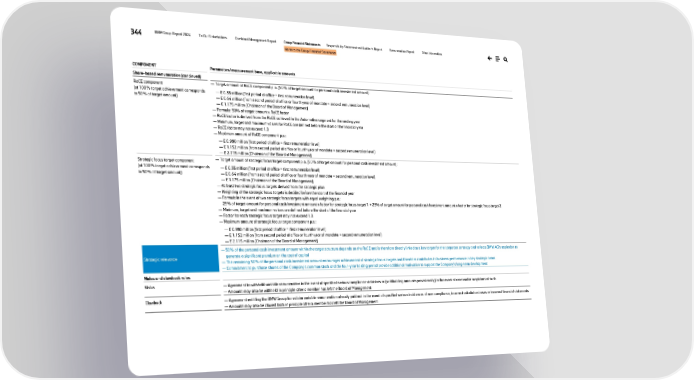 344 BMW Group Report 2024 To Our Stakeholders Combined Management Report Group Financial Statements Responsibility Statement and Auditor’s Report Remuneration Report Other Information Notes to the Group Financial Statements COMPONENT Parameters/measurement base, applicable amounts Share-based remuneration (continued) RoCE component (at 100% target achievement corresponds to 50% of target amount) — Target amount of RoCE component p.a. (50% of target amount for personal cash investment amount): — € 0.55 million (first period of office = first remuneration level) — € 0.64 million (from second period of office or fourth year of mandate = second remuneration level) — € 1.175 million (Chairman of the Board of Management) — Formula: 50% of target amount x RoCE factor — RoCE factor is derived from the RoCE achieved in the Automotive segment for the vesting year — Minimum, target and maximum values for RoCE are defined before the start of the financial year — RoCE factor may not exceed 1.8 — Maximum amount of RoCE component p.a.: — € 0.990 million (first period of office = first remuneration level) — € 1.152 million (from second period of office or fourth year of mandate = second remuneration level) — € 2.115 million (Chairman of the Board of Management) Strategic focus target component (at 100% target achievement corresponds to 50% of target amount) — Target amount of strategic focus target component p.a. (50% of target amount for personal cash investment amount): — € 0.55 million (first period of office = first remuneration level) — € 0.64 million (from second period of office or fourth year of mandate = second remuneration level) — € 1.175 million (Chairman of the Board of Management) — At least two strategic focus targets derived from the strategic plan — Weighting of the strategic focus targets is decided before the start of the financial year — Formula in the event of two strategic focus targets with equal weighting p.a.: 25% of target amount for personal cash investment amount x factor for strategic focus target 1 + 25% of target amount for personal cash investment amount x factor for strategic focus target 2 — Minimum, target and maximum values are defined before the start of the financial year — Factor for each strategic focus target may not exceed 1.8 — Maximum amount of strategic focus target component p.a.: — € 0.990 million (first period of office = first remuneration level) — € 1.152 million (from second period of office or fourth year of mandate = second remuneration level) — € 2.115 million (Chairman of the Board of Management) Strategic relevance — 50% of the personal cash investment amount within the target structure depends on the RoCE and is therefore directly linked to a key target for the corporate strategy and reflects BMW AG’s aspiration to generate a significant premium on the cost of capital — The remaining 50% of the personal cash investment amount encourages achievement of strategic focus targets and therefore contributes to business performance in key strategic areas — Commitment to purchase shares of the Company’s common stock and the four-year holding period provide additional motivation to support the Company’s long-term development Malus and clawback rules Malus — Agreement to withhold variable remuneration in the event of specified serious compliance violations or (withholding amounts provisionally) in the event of reasonable suspicions of such — Amounts may also be withheld in principle after a member has left the Board of Management Clawback — Agreement entitling the BMW Group to reclaim variable remuneration already paid out in the event of specified serious incidences of non-compliance, incorrect calculation bases or incorrect financial statements — Amounts may also be clawed back in principle after a member has left the Board of Management
