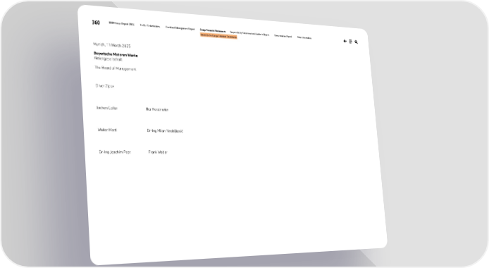 360 BMW Group Report 2024 To Our Stakeholders Combined Management Report Group Financial Statements Responsibility Statement and Auditor’s Report Remuneration Report Other Information Notes to the Group Financial Statements Munich, 11 March 2025 Bayerische Motoren Werke Aktiengesellschaft The Board of Management Oliver Zipse Jochen Goller Ilka Horstmeier Walter Mertl Dr-Ing Milan Nedeljković Dr-Ing Joachim Post Frank Weber
