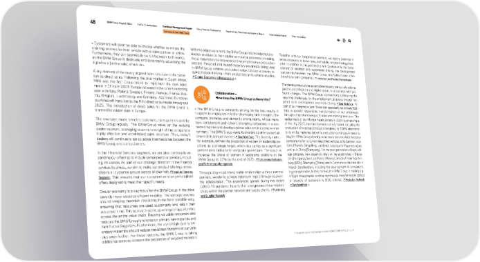 48 BMW Group Report 2024 To Our Stakeholders Combined Management Report Group Financial Statements Responsibility Statement and Auditor’s Report Remuneration Report Other Information Overview of the BMW Group » Customers will soon be able to choose whether to initiate the ordering process for their vehicle with a sales partner or online. Furthermore, they can seamlessly switch between both worlds, as the BMW Group is decisively and consistently advancing the digital sale (online sale) of vehicles. A key element of the newly aligned sales structure is the transi- tion to direct sales. Following the pilot market in South Africa, MINI was the first Group brand to implement the new sales model in China in 2023. Europe followed in the current reporting year with Italy, Poland, Sweden, Finland, Norway, France, Aus- tria, Belgium, Luxembourg and Germany. Additional European countries will transition to the MINI direct sales model throughout 2025. The introduction of direct sales for the BMW brand is planned for a later date in Europe. The new sales model benefits customers, sales partners and the BMW Group equally. The BMW Group relies on the existing dealer network, leveraging a central strength of the company: a highly effective and established sales structure. Thus, today's dealers will continue to act as active intermediaries between the BMW Group and our customers. In the Financial Services segment, we are also continually ex- panding our offerings to include comprehensive services, includ- ing insurance. As part of our strategic direction in the financial services business, we aim to make our product offerings acces- sible to all customer groups across all channels ↗ Financial Services Segment. This ensures that our customers receive personalised offers designed to meet their specific needs. Circular economy is a key focus for the BMW Group in the drive towards more resource-efficient mobility. The concept revolves around keeping materials circulating in the best possible way, ensuring that resources are used sustainably and retain their value over time. This approach opens up a range of opportunities across the entire value chain. Reusing valuable resources also reduces the BMW Group’s reliance on primary raw materials and their fluctuating prices. Furthermore, the use of high-quality sec- ondary materials should reduce the carbon footprint of our vehi- cles even further. For these reasons, the BMW Group is taking additional steps to increase the proportion of recycled materials. With this objective in mind, the BMW Group returns selected pro- duction residues to the supplier or material processor, enabling those materials to be recovered and returned in a new production process. Recycled and reused materials are already being used in BMW Group vehicles production today. Circular economy re- quires holistic thinking – from product design to vehicle recycling. ↗ Circular Economy and Resource Use « Collaboration – How does the BMW Group achieve this?* » The BMW Group is constantly striving for the best results. It supports its employees in further developing their strengths. The company promotes and demands strong teams, whose mem- bers complement each other's strengths, collaborate in a con- nected manner and develop optimal solutions in a complex envi- ronment. The BMW Group views its diversity as an important el- ement of its competitiveness ↗ Own Workforce. The diversity metric, for example, defines the proportion of women in leadership po- sitions as a strategic target, which also serves as a significant performance indicator for corporate governance. The aim is to increase the share of women in leadership positions at the BMW Group to 22% by the end of 2025. ↗ Performance Indicators and Performance Management Through long-established, stable relationships with our external partners, we aim to achieve maximum impact through trustwor- thy collaboration. The experiences gained during the recent COVID-19 pandemic have further strengthened these relation- ships within the partner network and supply chains. ↗ Purchasing and Supplier Network Together with our cooperation partners, we realise potential in terms of access to know-how, profitability and technology foot- print. In addition to the partnership with Qualcomm in the devel- opment of assisted and automated driving, the development partnership between the BMW Group and Solid Power offers benefits to both companies. ↗ Innovation and Product Technologies The development of the automotive industry, particularly with re- gard to electrification and digitalisation, is associated with pro- found changes. The BMW Group is proactively addressing the resulting challenges for the employment structure through tar- geted skills development and restructuring ↗ Own Workforce. As part of our integrative Just-Transition approach, we actively facil- itate a socially responsible transformation of our employees through comprehensive qualification and training measures. The realignment of our Munich headquarters in 2024 is an example of this. By 2027, the transformation of a full plant, including the production of internal combustion engines, to 100% electromo- bility will be implemented while production continues. Already to- day, the BMW Group develops and manufactures electrified drive components for its current electrified vehicles at its German loca- tions (Munich, Dingolfing, Landshut, Leipzig and Regensburg) as well as in China (Shenyang). For the next generation of high-volt- age batteries, new assembly sites will be established in Debre- cen (Hungary), San Luis Potosí (Mexico), Woodruff near Spartan- burg (USA), Shenyang (China) and in Germany at the new site in Irlbach-Straßkirchen, including the development of correspond- ing competencies. In this context, the BMW Group is making sig- nificant investments to drive continuous transformation across all aspects of sustainability (ESG criteria). ↗ Production Network, 
