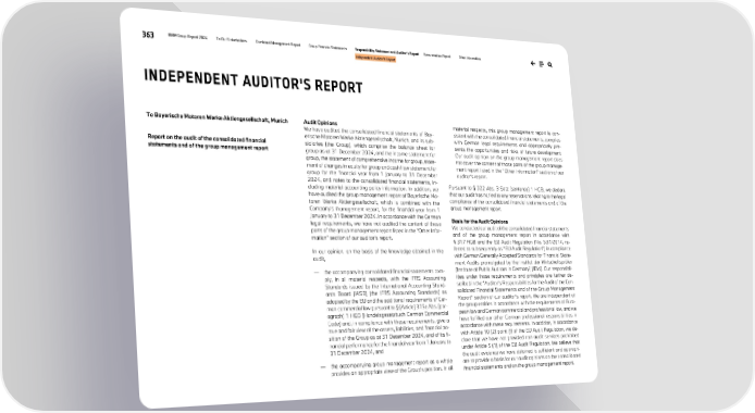 363 BMW Group Report 2024 To Our Stakeholders Combined Management Report Group Financial Statements Responsibility Statement and Auditor’s Report Remuneration Report Other Information Independent Auditor’s Report To Bayerische Motoren Werke Aktiengesellschaft, Munich Report on the audit of the consolidated financial statements and of the group management report Audit Opinions We have audited the consolidated financial statements of Bay- erische Motoren Werke Aktiengesellschaft, Munich, and its sub- sidiaries (the Group), which comprise the balance sheet for group as at 31 December 2024, and the income statement for group, the statement of comprehensive income for group, state- ment of changes in equity for group and cash flow statement for group for the financial year from 1 January to 31 December 2024, and notes to the consolidated financial statements, in- cluding material accounting policy information. In addition, we have audited the group management report of Bayerische Mo- toren Werke Aktiengesellschaft, which is combined with the Company’s management report, for the financial year from 1 January to 31 December 2024. In accordance with the German legal requirements, we have not audited the content of those parts of the group management report listed in the "Other Infor- mation" section of our auditor’s report. In our opinion, on the basis of the knowledge obtained in the audit, — the accompanying consolidated financial statements com- ply, in all material respects, with the IFRS Accounting Standards issued by the International Accounting Stand- ards Board (IASB) (the IFRS Accounting Standards) as adopted by the EU and the additional requirements of Ger- man commercial law pursuant to § [Article] 315e Abs. [par- agraph] 1 HGB [Handelsgesetzbuch German Commercial Code] and, in compliance with these requirements, give a true and fair view of the assets, liabilities, and financial po- sition of the Group as at 31 December 2024, and of its fi- nancial performance for the financial year from 1 January to 31 December 2024, and — the accompanying group management report as a whole provides an appropriate view of the Group’s position. In all material respects, this group management report is con- sistent with the consolidated financial statements, complies with German legal requirements and appropriately pre- sents the opportunities and risks of future development. Our audit opinion on the group management report does not cover the content of those parts of the group manage- ment report listed in the “Other Information” section of our auditor’s report. Pursuant to § 322 Abs. 3 Satz [sentence] 1 HGB, we declare that our audit has not led to any reservations relating to the legal compliance of the consolidated financial statements and of the group management report. Basis for the Audit Opinions We conducted our audit of the consolidated financial statements and of the group management report in accordance with § 317 HGB and the EU Audit Regulation (No. 537/2014, re- ferred to subsequently as “EU Audit Regulation”) in compliance with German Generally Accepted Standards for Financial State- ment Audits promulgated by the Institut der Wirtschaftsprüfer [Institute of Public Auditors in Germany] (IDW). Our responsibil- ities under those requirements and principles are further de- scribed in the “Auditor’s Responsibilities for the Audit of the Con- solidated Financial Statements and of the Group Management Report” section of our auditor’s report. We are independent of the group entities in accordance with the requirements of Euro- pean law and German commercial and professional law, and we have fulfilled our other German professional responsibilities in accordance with these requirements. In addition, in accordance with Article 10 (2) point (f) of the EU Audit Regulation, we de- clare that we have not provided non-audit services prohibited under Article 5 (1) of the EU Audit Regulation. We believe that the audit evidence we have obtained is sufficient and appropri- ate to provide a basis for our audit opinions on the consolidated financial statements and on the group management report. INDEPENDENT AUDITOR’S REPORT