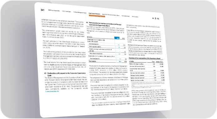 341 BMW Group Report 2024 To Our Stakeholders Combined Management Report Group Financial Statements Responsibility Statement and Auditor’s Report Remuneration Report Other Information Notes to the Group Financial Statements settlement date and on the settlement date itself. The expense for such programmes is recognised in the income statement (as personnel expense) on a straight-line basis over the vesting pe- riod of the options and in the balance sheet as a provision. The remuneration system does not provide for any further matching components for the members of the Board of Manage- ment from financial year 2021 or for the senior department heads from financial year 2022. The cash settlement of the share-based remuneration compo- nent is measured at fair value on the balance sheet date (closing price of BMW AG common stock in Xetra trading on 31 Decem- ber 2024). The total carrying amount of the provision for the share-based remuneration component for eligible active and former Board of Management members and senior department heads was 2024 € 2,783,721 (2023: € 5,982,815). The total income from the share-based remuneration compo- nent for eligible active and former Board of Management mem- bers and senior department heads amounted to € 65,186 in fi- nancial year (2023: expense of € 1,598,368). 43 Declaration with respect to the Corporate Governance Code The Board of Management and the Supervisory Board of Bayer- ische Motoren Werke Aktiengesellschaft have issued the pre- scribed Declaration of Compliance with the recommendations of the "Government Commission on the German Corporate Govern- ance Code" required by § 161 AktG. The declaration has been made permanently available on the Company's website ↗ www.bmwgroup.com. 44 Remuneration for members of the Board of Manage- ment and the Supervisory Board The expenses recorded in accordance with IFRS in financial year 2024 for remuneration for the active members of the Board of Management and Supervisory Board are broken down as fol- lows: in € million 2024 2023 Remuneration for the members of the Board of Management Short-term benefits 19.1 32.9 Other long-term benefits 3.2 3.2 Benefits resulting from termination of the Board mandate – 5.4 Share-based remuneration – 0.1 0.2 Remuneration for the members of the Supervisory Board Short-term benefits 5.8 5.8 Total expense 28.0 47.5 The income for the active members of the Board of Management arising from share-based remuneration, in effect up to and in- cluding 2020, amounted to € 0.1 million (2023: expense € 0.2 million). The provision for the share-based remuneration component amounted to € 0.3 million (2023: € 0.9 million). The remuneration of former members of the Board of Manage- ment and their dependants amounted to € 13.2 million (2023: € 11.9 million). Provisions have been recognised for pension obligations to ac- tive members of the Board of Management in accordance with IAS 19 in the amount of € 22.7 million (2023: € 16.5 million). Provisions have been recognised for pension obligations to for- mer members of the Board of Management and their depend- ants in accordance with IAS 19 in the amount of € 93.3 million (2023: € 101.6 million). The remuneration system for members of the Supervisory Board does not include any stock options, value appreciation rights comparable to stock options or any other share-based remuner- ation components. In accordance with the Articles of Incorporation, each member of the Supervisory Board of BMW AG who does not exercise any additional function relevant to remuneration receives fixed remu- neration of € 200,000 p.a. in addition to the reimbursement of his or her reasonable expenses, plus an attendance fee of € 2,000 for every plenary meeting that the member has at- tended. Members of the Supervisory Board who perform a function rele- vant to remuneration such as the Chairman or Deputy Chairman of the Supervisory Board or the chairmen or members of com- mittees, provided these committees meet on at least three days in the financial year, receive higher remuneration on account of these additional requirements. Overview of the remuneration of the Supervisory Board1 in € million Factor Amount in € p.a.3 Member of the Supervisory Board 1.00 200,000 Chairman of the Supervisory Board 3.00 600,000 Deputy Chairman of the Supervisory Board 2.00 400,000 Chairman of the Audit Committee2 2.25 450,000 Chairman of another committee2 2.00 400,000 Member of the Audit Committee2 2.00 400,000 Member of another committee2 1.50 300,000 1 If a Supervisory Board member performs more than one of the functions referred to above, their remuneration is measured only on the basis of the function that is remunerated with the highest amount. 2 Provided that the committee has met on at least three days during the financial year. 3 Plus an attendance fee of € 2,000 per plenary session. BMW Group companies did not grant any loans to members of the Board of Management or the Supervisory Board in the 2024 financial year, nor did they enter into any contingent liabilities in their favour. In the reporting year, members of the Board of Man- agement and the Supervisory Board concluded contracts with BMW Group companies for the purchase of vehicles, other ser- vices (including maintenance and repair work), vehicle leasing and cash deposits at arm’s length conditions.