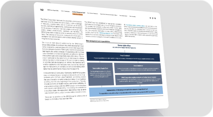 162 BMW Group Report 2024 To Our Stakeholders Combined Management Report Group Financial Statements Responsibility Statement and Auditor’s Report Remuneration Report Other Information Sustainability Statement The BMW Group takes measures for prevention, control and re- mediation on a risk-based and ad hoc basis. It uses a catalogue of measures, questionnaires and an interlinked set of training courses, contractual agreements, certifications and inspections for this purpose. If actual or imminent violations of human rights and/or related environmental standards are identified, the BMW Group takes remedial action to prevent, end or minimise them. The purpose of the control measures is to thoroughly in- vestigate risks and indications and to check whether actual in- fringements have occurred. The issue of child labour is addressed by the BMW Group’s Group-wide policies. According to this, child’s development must not be hindered by undertaking any kind of work that keeps them from receiving an education Their dignity must be respected and their health and safety protected. In accordance with ILO Core Labor Standards and national legislation, we adhere to minimum employment ages and categorically reject child labour. This ap- plies in particular to the worst forms of child labour for children and young people under the age of 18, practices akin to slavery, or activities that are dangerous or immoral. We therefore verify whether applicants and employees have reached the minimum age for employment, for example, as well as determining which tasks may be performed by those under the age of 18. In line with the ILO Core Labour Standards, the BMW Group also does not tolerate forced or compulsory labour of any kind. In ac- cordance with ILO Core Labor Standards, we strongly oppose the use of forced or unlawful compulsory labour in our business activities, from the very beginning of the supply chain. This also includes all forms of modern slavery and human trafficking. All employment contracts with the BMW Group or with enterprises and suppliers commissioned by it must always be concluded on a voluntary basis. All employment relationships may be termi- nated by both parties, subject to reasonable or statutory notice. There are no activities at the BMW Group for which a risk of forced or child labour has been identified. The BMW Group has established an appropriate complaints mechanism as an integral part of its due diligence processes. This enables the Company to effectively prevent human rights and environmental violations and take immediate remedial ac- tion. The complaints mechanism includes various whistleblower systems, such as the ↗ BMW Group SpeakUP Line. Employees with questions or concerns relating to compliance can discuss these matters with their managers or relevant Compliance functions. 1 Department program design, prevention. 2 Performing duties for the Human Rights Officer. All ↗ Compliance incident reporting channels are published on the BMW Group website and are available to all internal and external persons, provided the underlying issue is related to the Com- pany. Reported cases are checked and remedial action is taken promptly if necessary. In the reporting year, no customer-related reports of human rights violations were received through the es- tablished channels. Human rights officer acc. to the German Supply Chain Due Diligence Act Group Compliance1 Program responsibility human rights compliance, design and monitoring2 of risk management and risk analysis, complaints mechanism, reporting Nachhaltigkeit Lieferkette Steuerung und Umsetzung von Sorgfaltspflichten- prozessen (z. B. Risikoanalyse, Präventions- und Abhilfemaßnahmen, Wirksamkeitsanalyse) für Ein- kauf und Lieferantennetzwerk Group Compliance1 Steuerung und Umsetzung von Sorgfaltspflichtenprozessen (z. B. Risikoanalyse, Präventions- und Abhilfemaß- nahmen, Wirksamkeitsanalyse) für eigenen Geschäftsbereich sowie für weitere Geschäftspartner Konzernweites Compliance Netzwerk sowie weitere unternehmensinterne Netzwerke Prozessverantwortung (zu u. a. Arbeitsschutz, Umweltschutz, Personal, Konzernsicherheit) im eigenen Ge- schäftsbereich sowie teilweise für weitere Geschäftspartner (z. B. Händler) Implementation of risk management and further measures at operational level The responsibility to comply with due diligence obligations resides with the responsible operating units of the BMW Group companies Risk management and responsibilities Group Compliance1 Steering and implementation of due diligence processes (e. g. risk analysis, prevention and remediation measures, effectiveness analysis) for own business area and for other business partners BMW Group-wide compliance network and further internal networks Process responsibility (for occupational health and safety, environmental management, personnel, corporate security among other topics) for own business area as well as partially for other business partners (e. g. dealers) Sustainability Supply Chain Steering and implementation of due diligence processes (e. g. risk analysis, prevention and re- mediation measures, effectiveness analysis) for purchasing and supplier network